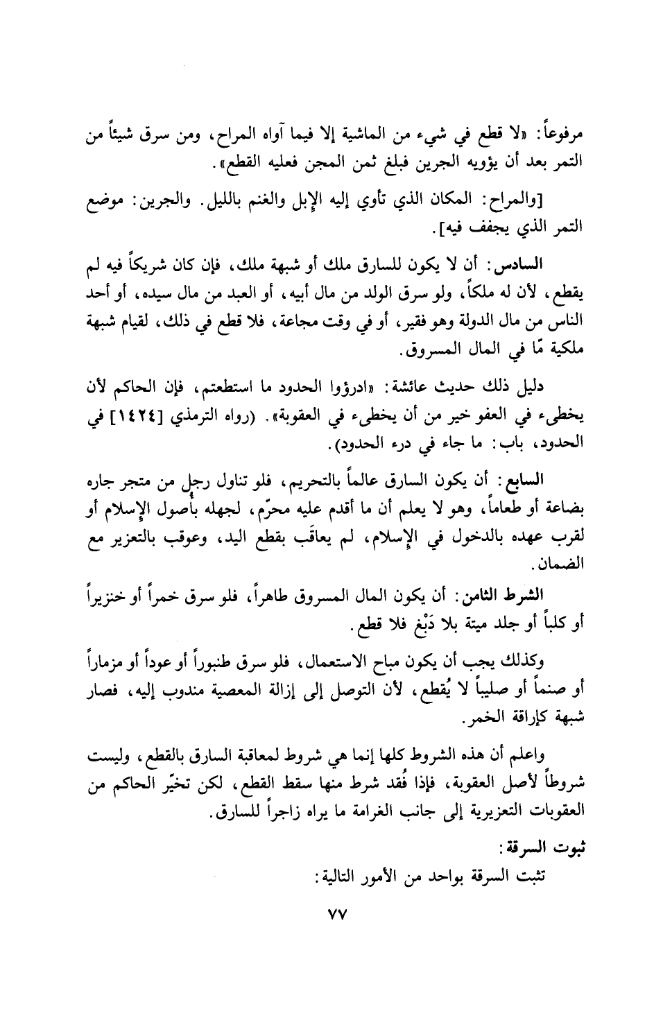 مرفوعاً: "لا قطع في شيء من الماشية إلا فيما آواه المراح، ومن سرق شيئاً من التمر بعد أن يؤويه الجرين فبلغ ثمن المجن فعليه القطع".