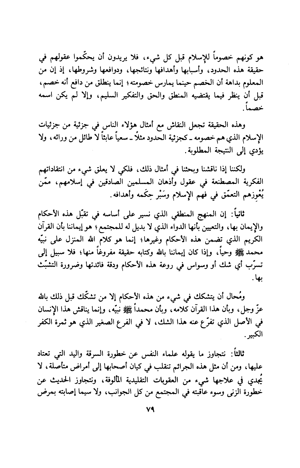 وهذه الحقيقة تجعل النقاش مع أمثال هؤلاء الناس في جزئية من جزئيات الإسلام الذي هم خصومه ـ كجزئية الحدود مثلاً ـ سعياً عابثاً لا طائل من ورائه، ولا يؤدي إلى النتيجة المطلوبة.