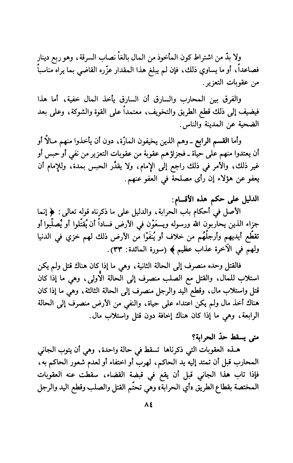 الأصل في أحكام باب الحرابة، والدليل على ما ذكرناه قوله تعالى: {إِنَّمَا جَزَاء الَّذِينَ يُحَارِبُونَ اللهَ وَرَسُولَهُ وَيَسْعَوْنَ فِي الأَرْضِ فَسَاداً أَن يُقَتَّلُواْ أَوْ يُصَلَّبُواْ أَوْ تُقَطَّعَ أَيْدِيهِمْ وَأَرْجُلُهُم مِّنْ خِلافٍ أَوْ يُنفَوْاْ مِنَ الأَرْضِ ذَلِكَ لَهُمْ خِزْيٌ فِي الدُّنْيَا وَلَهُمْ فِي الآخِرَةِ عَذَابٌ عَظِيمٌ} (المائدة: 33).