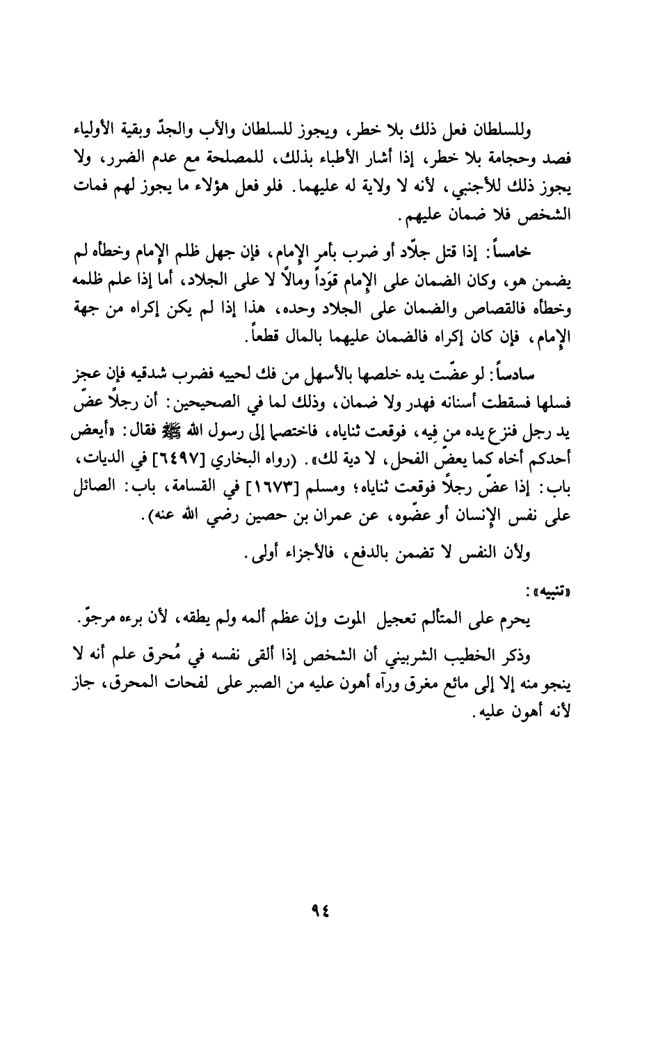 خامساً: إذا قتل جلاد أو ضرب بأمر الإمام، فإن جهل ظلم الإمام وخطأه لم يضمن هو، وكان الضمان على إمام قوداً ومالاً لا على الجلاد، أما إذا علم ظلمه وخطأه فالقصاص والضمان على الجلاد وحده، هذا إذا لم يكن إكراه من جهة الإمام، فإن كان إكراه فالضمان عليهما بالمال قطعاً.