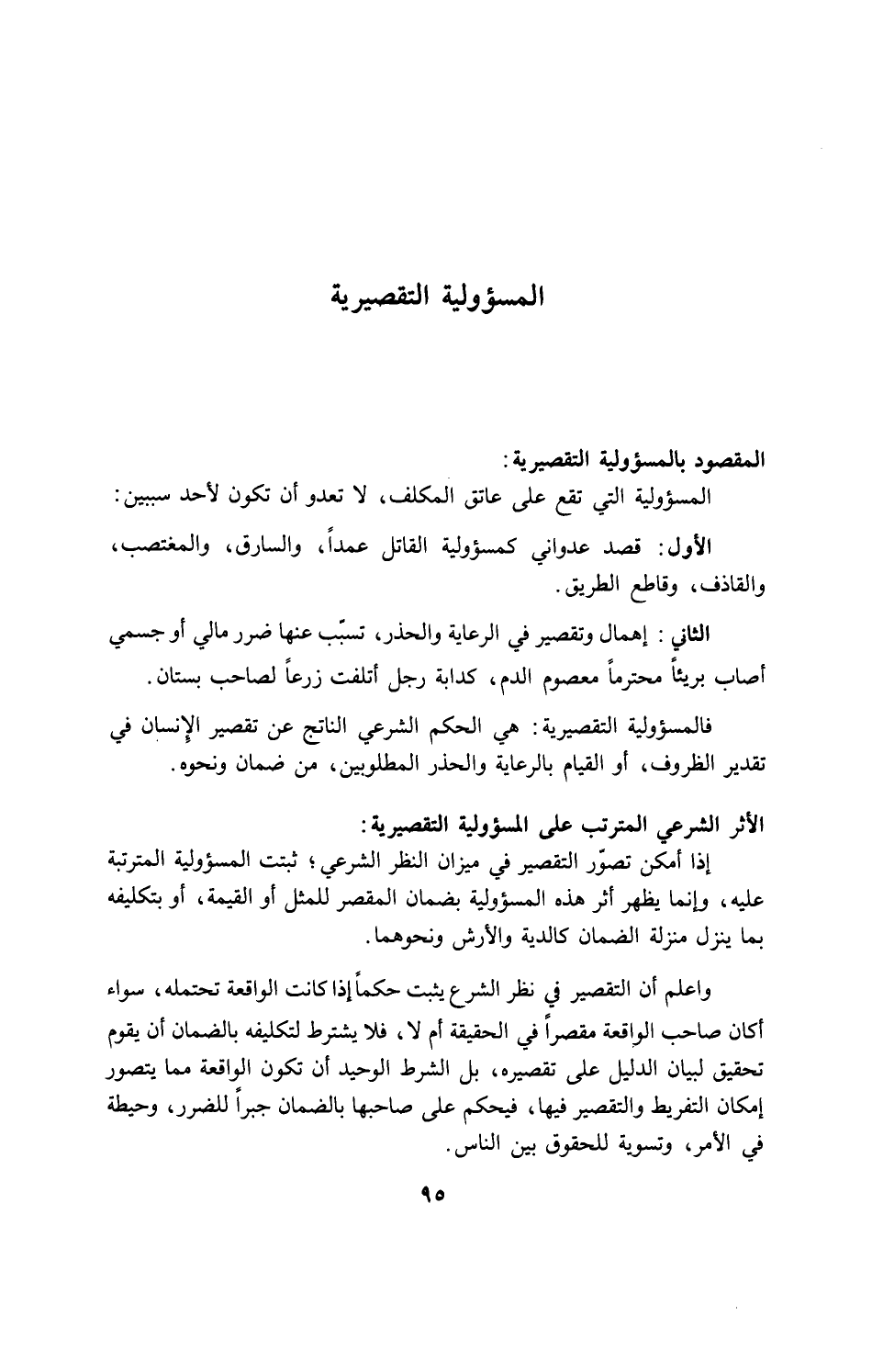 واعلم أن التقصير في نظر الشرع يثبت حكماً إذا كانت الواقعة تحتمله، سواء أكان صاحب الواقعة مقصراً في الحقيقة أم لا، فلا يشترط لتكليفه بالضمان أن يقوم تحقيق لبيان الدليل على تقصيره، بل الشرط الوحيد أن يكون الواقعة مما يتصور إمكان التفريط والتقصير فيها، فيحكم على صاحبها بالضمان جبراً للضرر، وحيطة في الأمر، وتسوية للحقوق بين الناس.
