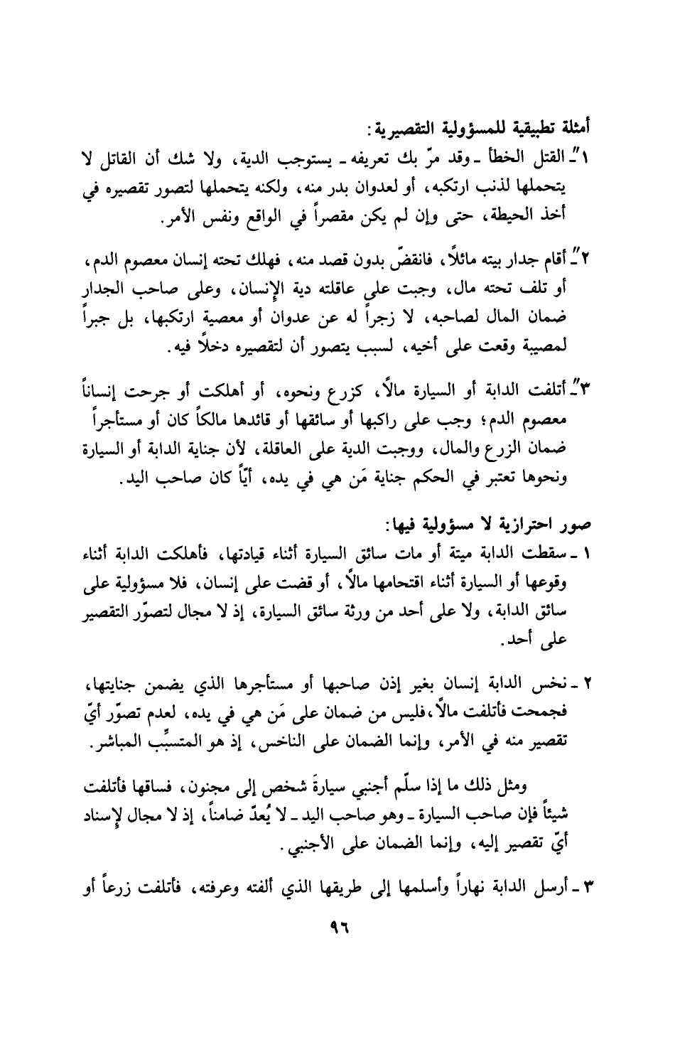1 - سقطت الدابة ميتة أو مات سائق السيارة أثناء قيادتها، فأهلكت الدابة أثناء وقوعها أو السيارة أثناء اقتحامها مالاً، أو قضت على إنسان، فلا مسؤولية على سائق الدابة، ولا على أحد من ورثة سائق السيارة، إذ لا مجال لتصور التقصير على أحد.