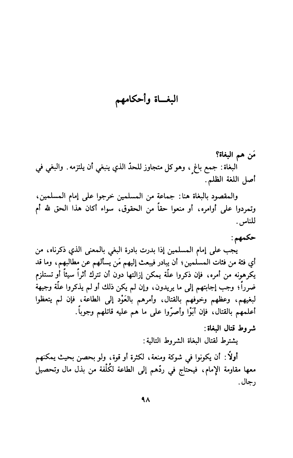 يجب على أمام المسلمين إذا بدرت بادرة البغي بالمعني الذي ذكرناه، من أي فئة من فئات المسلمين؛ أ، يبادر فيبعث إليهم من يسألهم عن مطالبهم، وما قد يكرهونه من أمره، فإن ذكروا علة يمكن إزالتها دون أن تترك أثراً سيئاً أو تستلزم ضرراً؛ وجب إجابتهم إلى ما يريدون، وإن لم يكن ذلك أو لم يذكروا علة وجيهة لبغيهم، وعظهم وخوفهم بالقتال، وأمرهم بالعود إلى الطاعة، فإن لم يتعظوا أعلمهم بالقتال، فإن أبوا وأصروا على ما هم عليه قاتلهم وجوباً.