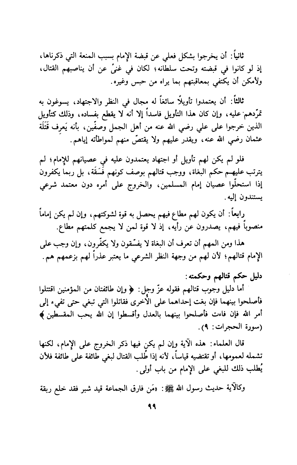 ثالثاً: أن يعتمدوا تأويلاً سائغاً له مجال في النظر والاجتهاد، يسوغون به تمردهم عليه، وإن كان هذا التأويل فاسداً إلا أنه لا يقطع بفساده، وذلك كتأويل الذين خرجوا على علي رضي الله عنه من أهل الجمل وصفين، بأنه يعرف قتلة عثمان رضي الله عنه، ويقدر عليهم ولا يقتص منهم لمواطأته إياهم.