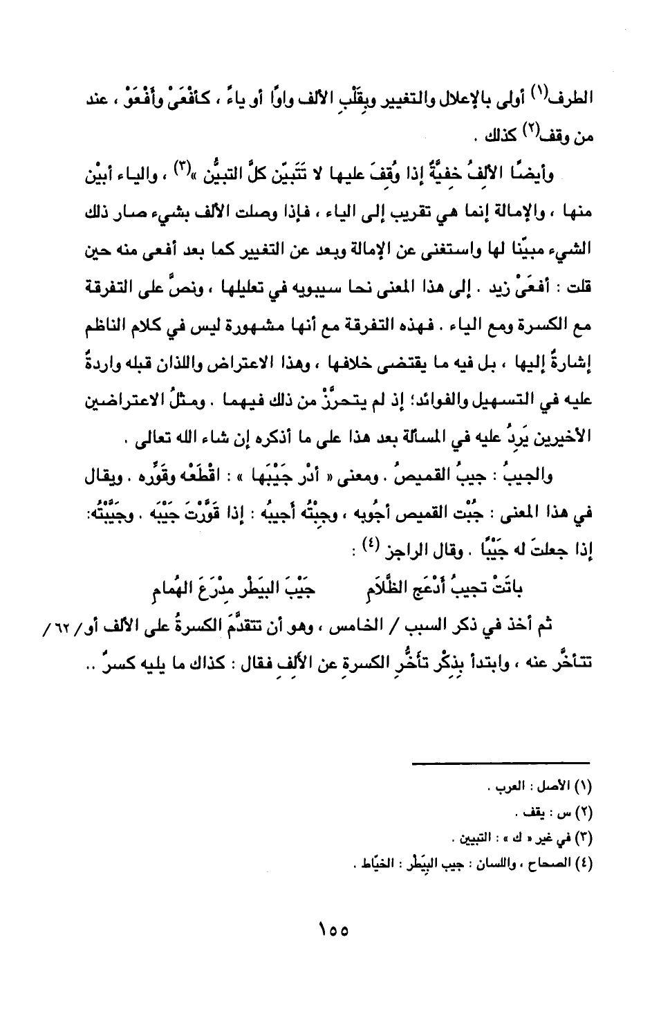 الطرف أولى بالإعلال والتغيير وبقلب الألف واوا أو ياء كأفعى وأَفْعَوْ عند من وقف كذلك وأيضا الألف خفية إذا وقف عليها لا تتبين كل التبين» والياء أبين