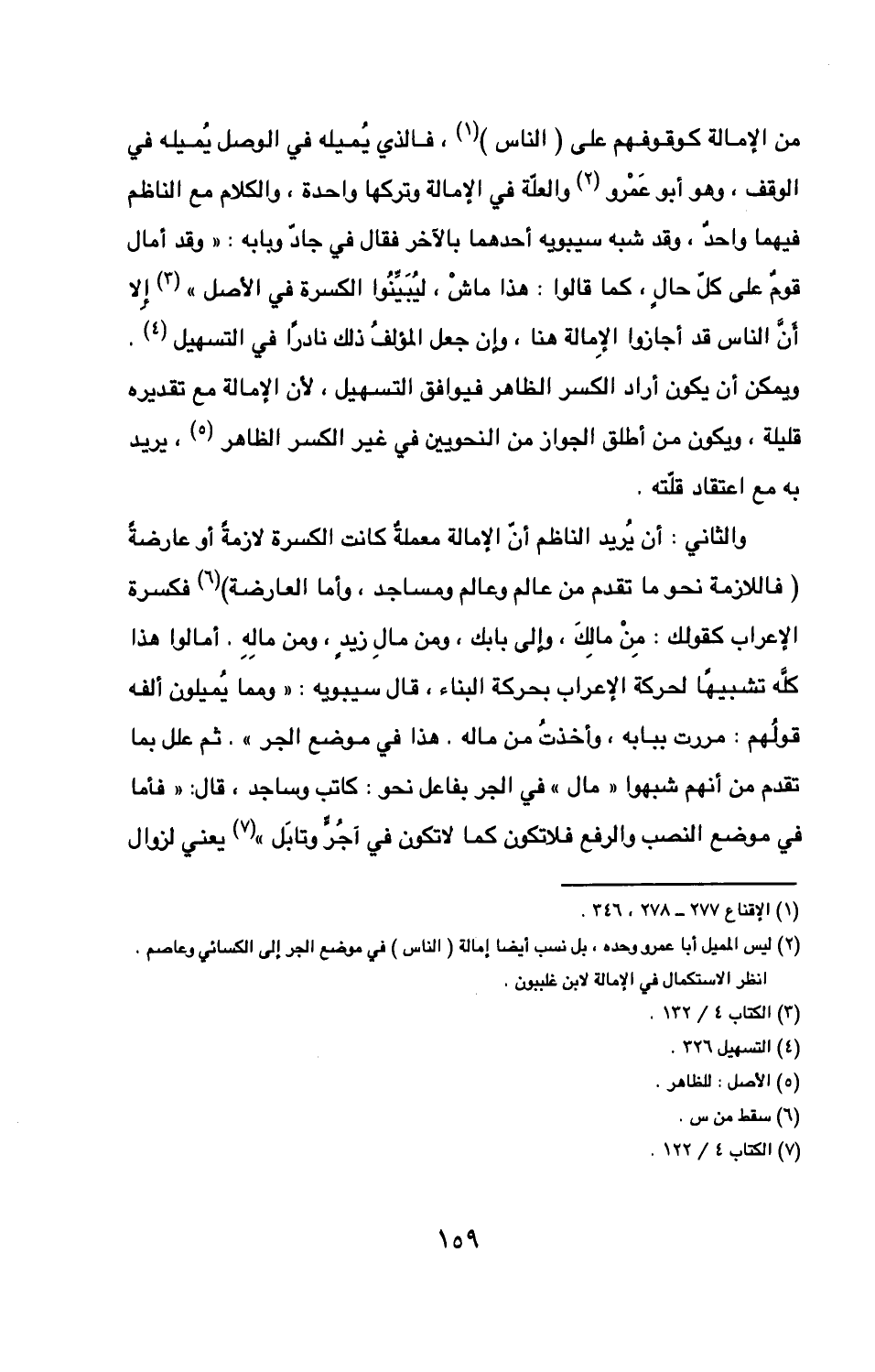 به مع اعتقاد قلته والثاني أن يريد الناظم أن الإمالة معملةٌ كانت الكسرة لازمة أو عارضة فاللازمة نحو ما تقدم من عالم وعالم* ومساجد وأما العارضة فكسرة الإعراب كقولك من مالك وإلى بابك ومن مال زيد ومن ماله أمالوا هذا كله تشبيها لحركة الإعراب بحركة البناء قال سيبويه «ومما يميلون ألفه قولهم مررت ببابه وأخذت من ماله هذا في موضع الجر» ثم علل بما تقدم من أنهم شبهوا «مال» في الجر بفاعل نحو كاتب وساجد قال «فأما في موضع النصب والرفع فلا تكون كما لا تكون في آجر وتابل» يعني لزوال