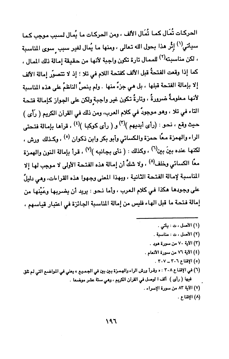 لكنها عنده بين بين وكذلك {نأى بجانبه} قرأ بإمالة النون والهمزة معا الكسائي وخلف ولا شك أن إمالة هذه الفتحة الأولى لا موجب لها إلا المناسبة لإمالة الفتحة الثانية وبهذا المعنى وجهوا هذه القراءات وهي دليل على وجودها هكذا في كلام العرب وأما نحو يريد أن يضربها وعَيْنها من إمالة فتحة ما قبل الهاء فليس من إمالة المناسبة الجائزة في اعتبار قياسهم