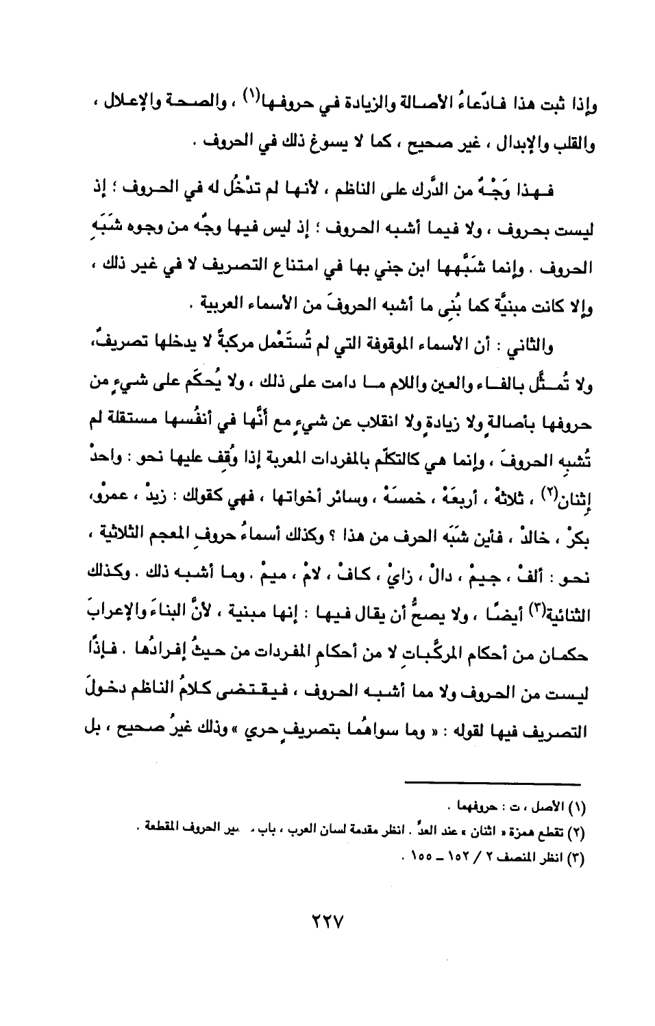 ليست من الحروف ولا مما أشبه الحروف فيقتضي كلام الناظم دخول التصريف فيها لقوله وما سواهما بتصريف حري وذلك غير صحيح بل