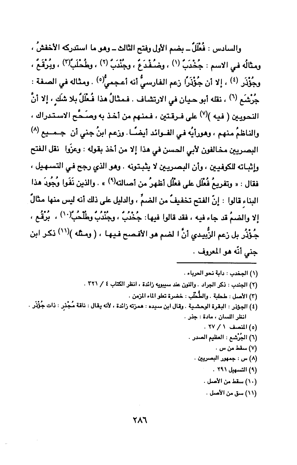 ومثاله في الاسم جُخْدَب وضُفْدَع وجُندَب وطُحلَب وبُرقَع