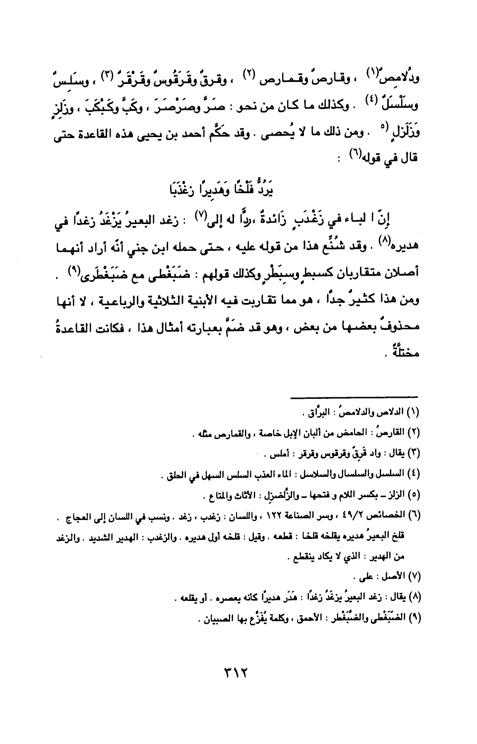 إن الباء في زغدب* زائدة ردا له إلى زغد البعير يزغد زغدا في هديره وقد شنع هذا من قوله عليه حتى حمله ابن جني أنه أراد أنهما أصلان متقاربان كسبط وسبطر وكذلك قولهم ضبغطى مع ضبغطرى وكم خذا كثير جدا هو مما تقاربت فيه الأبنية الثلاثية والرباعية لا أنها محذوف بعضها من بعض وهو قد ضم بعبارته أمثال هذا فكانت القاعدة