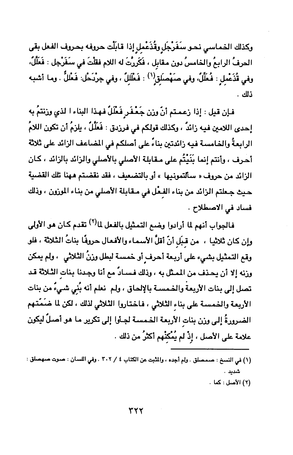 فساد في الاصطلاح فالجواب أنهم لما أرادوا وضع التمثيل بالفعل لما تقدم كان هو الأولى وإن كان ثلاثيا من قبل أن أقل الأسماء والأفعال حروف بنات الثلاثة فلو وقع التمثيل بشيء على أربعة أحرف أو خمسة لبطل وزن الثلاثي ولم يمكن وزنه إلا أن يحذف من الممثل به وذلك فساد مع أنا وجدنا بنات الثلاثة قد تصل إلى بنات الأربعة والخمسة بالإلحاق ولم نعلم أنه بني شيء من بنات الأربعة والخمسة على بناء الثلاثي فاختاروا الثلاثي لذلك لكن لما ضمتهم الضرورة إلى وزن بنات الأربعة الخمسة* لجأوا إلى تكرير ما هو أصل ليكون علامة على الأصل إذ لم يمكنهم أكثر من ذلك
