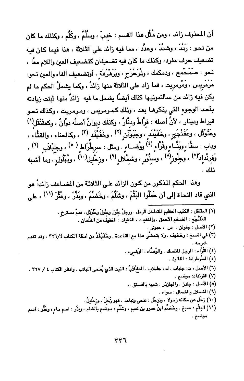 ذلك وهذا الحكم المذكور من كون الزائد على الثلاثة من المضاعف زائدا هو الذي قاد النحاة إلى أن حملوا البقّم وشلم وخضم وبذر وعثر على