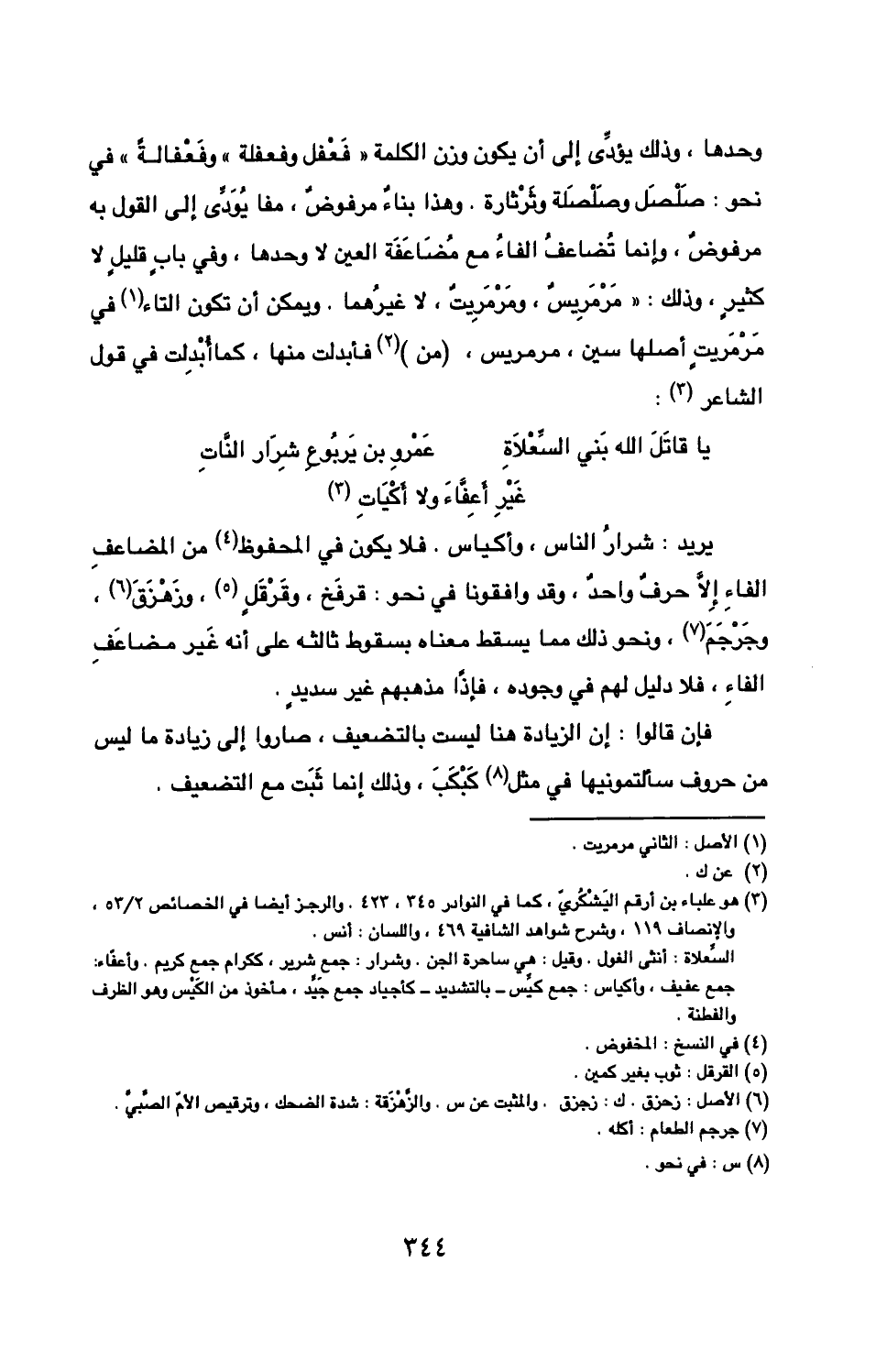 الفاء فلا دليل لهم في وجوده فإذا مذهبهم غير سديد فإن قالوا إن الزيادة هنا ليست بالتضعيف صاروا إلى زيادة ما ليس من حروف سألتمونيها في مثل كبكب وذلك إنما ثبت مع التضعيف