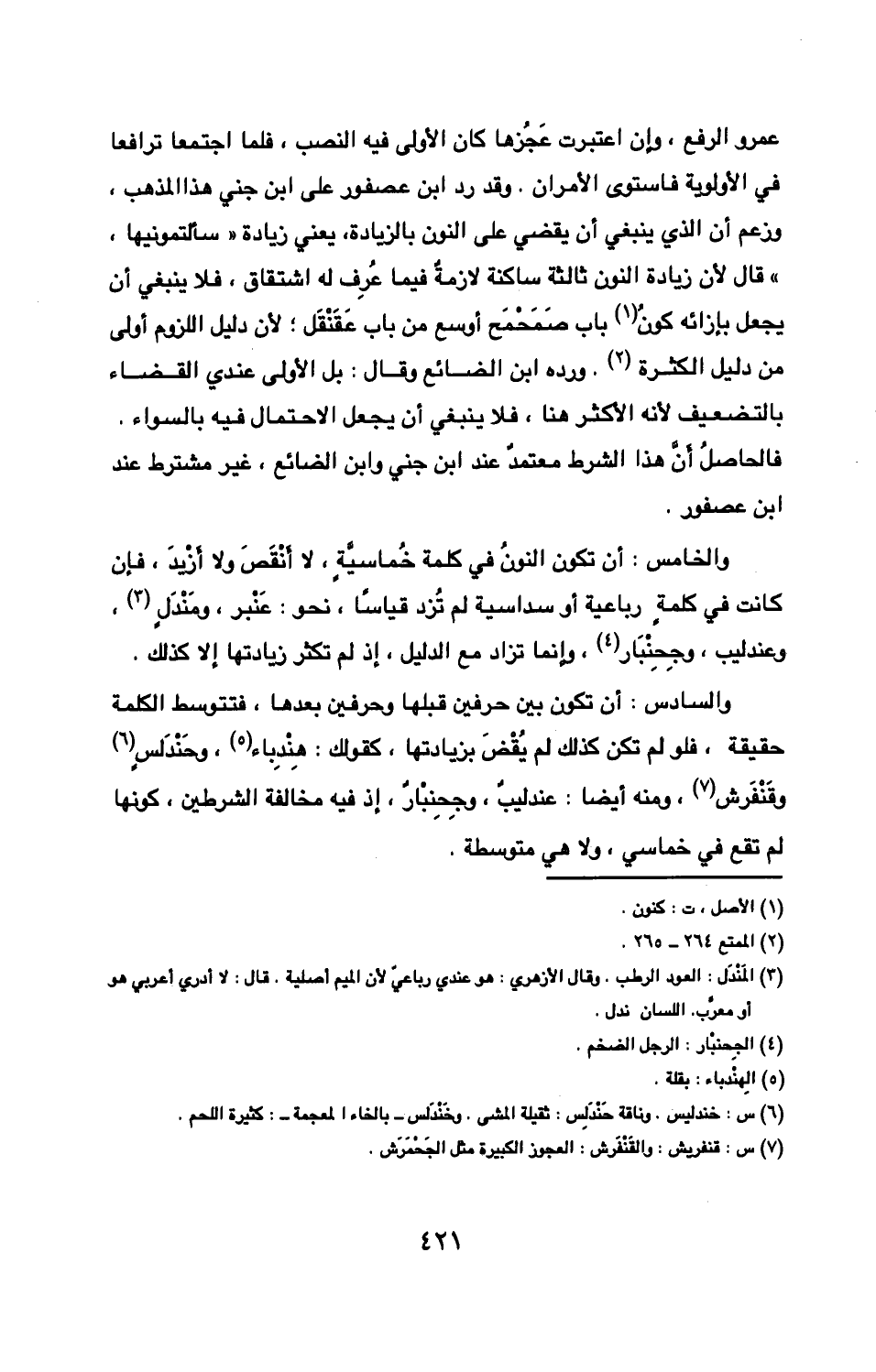 وقَنْفَرش ومنه أيضا عندليب وجحنبار إذ فيه مخالفة الشرطين كونها