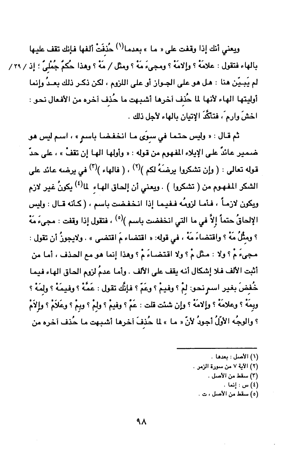 ويعني أنك إذا وقفت على «ما» بعدما حُذفتْ ألفها فإنك تقف عليها