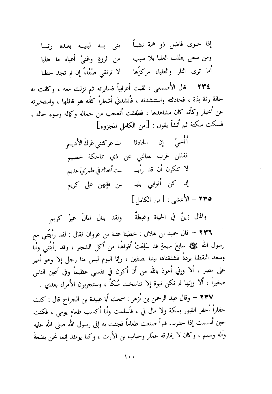 234- قال الأصمعي: لقيت أعرابيا فسايرته ثم نزلت معه، وكانت له حالة رثة بذة، فحادثته واستنشدته، فأنشدني أشعارا كأنه هو قائلها، واستخبرته عن أخبار وكأنه كان مشاهدها، فطفقت أتعجب من جماله وكماله وسوء حاله، فسكت سكتة ثم أنشأ يقول: [من الكامل المجزوء]