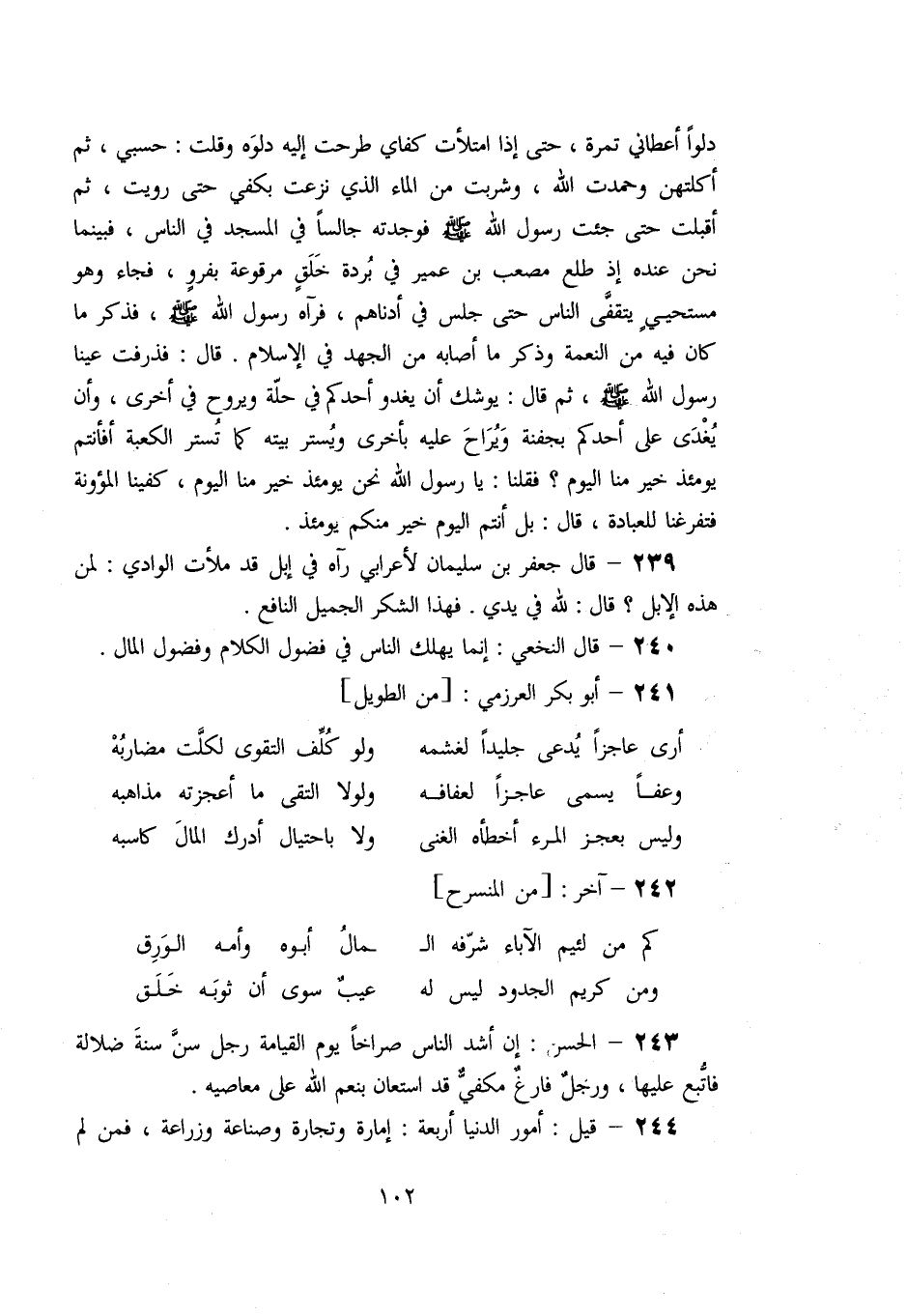 239- قال جعفر بن سليمان لأعرابي رآه في إبل قد ملأت الوادي: لمن هذه الإبل؟ قال: لله في يدي. فهذا الشكر الجميل النافع.