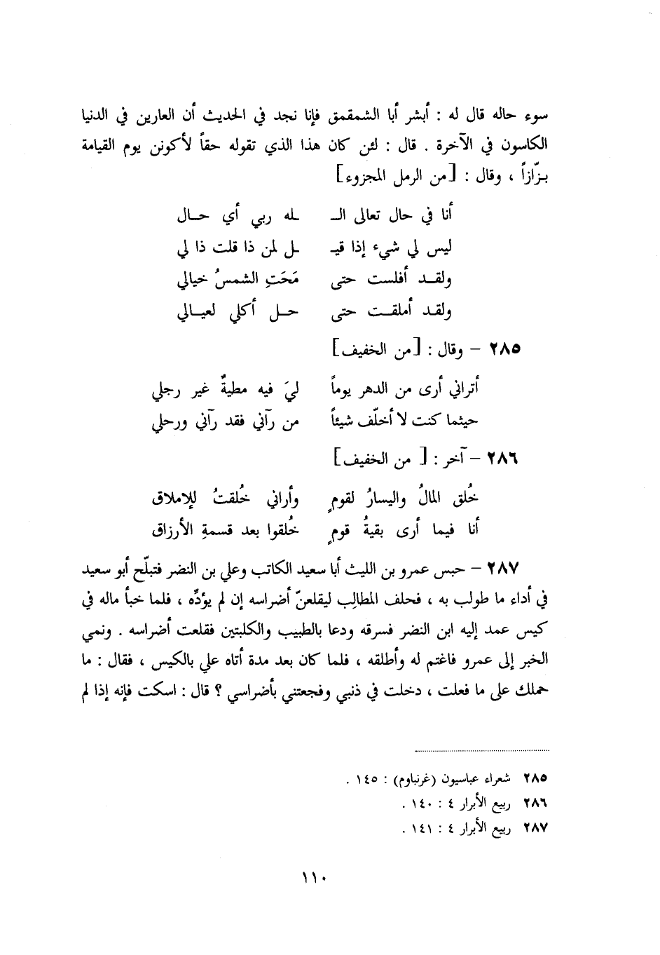 سوء حاله قال له: أبشر أبا الشمقمق فإنا نجد في الحديث أن العارين في الدنيا الكاسون في الآخرة. قال: لئن كان هذا الذي تقوله حقا لأكونن يوم القيامة بزّازا، وقال: [من الرمل المجزوء]