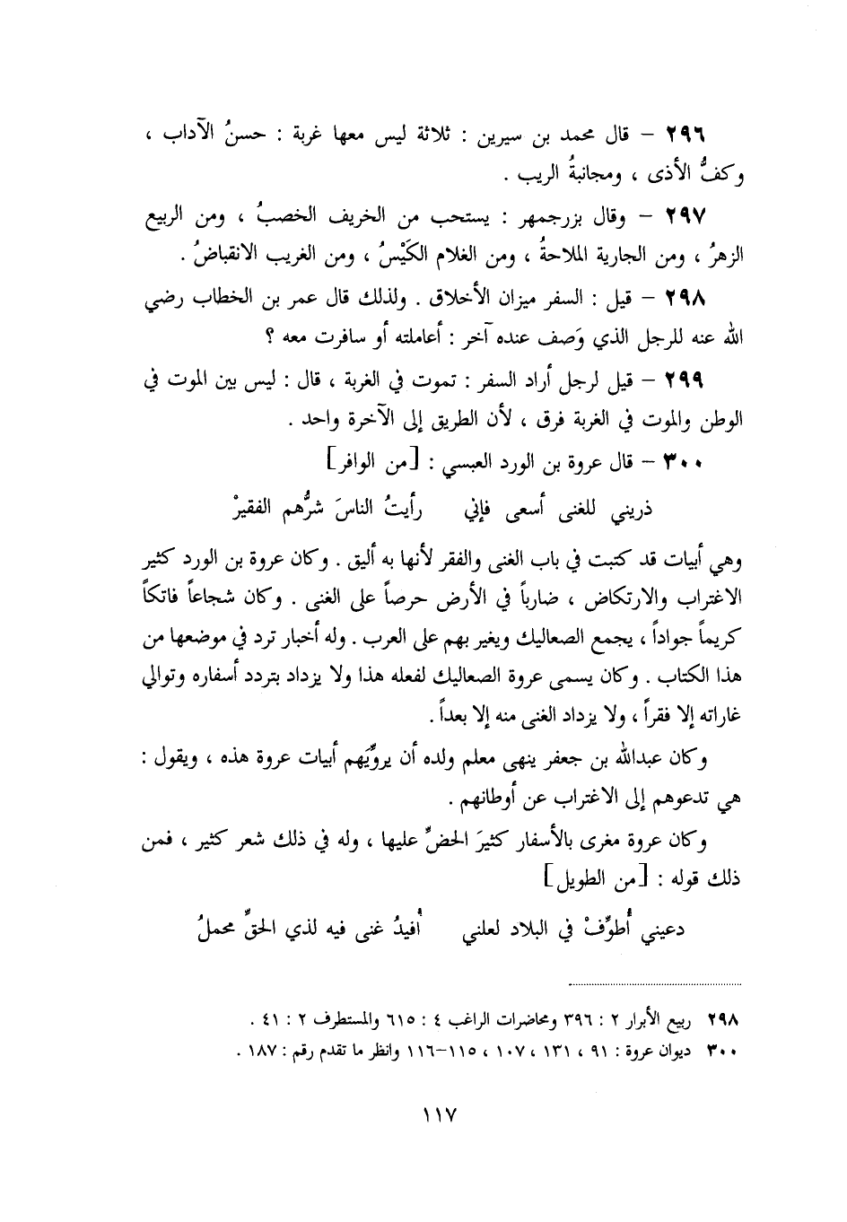 «298» - قيل: السفر ميزان الأخلاق. ولذلك قال عمر بن الخطاب رضي الله عنه للرجل الذي وصف عنده آخر: أعاملته أو سافرت معه؟