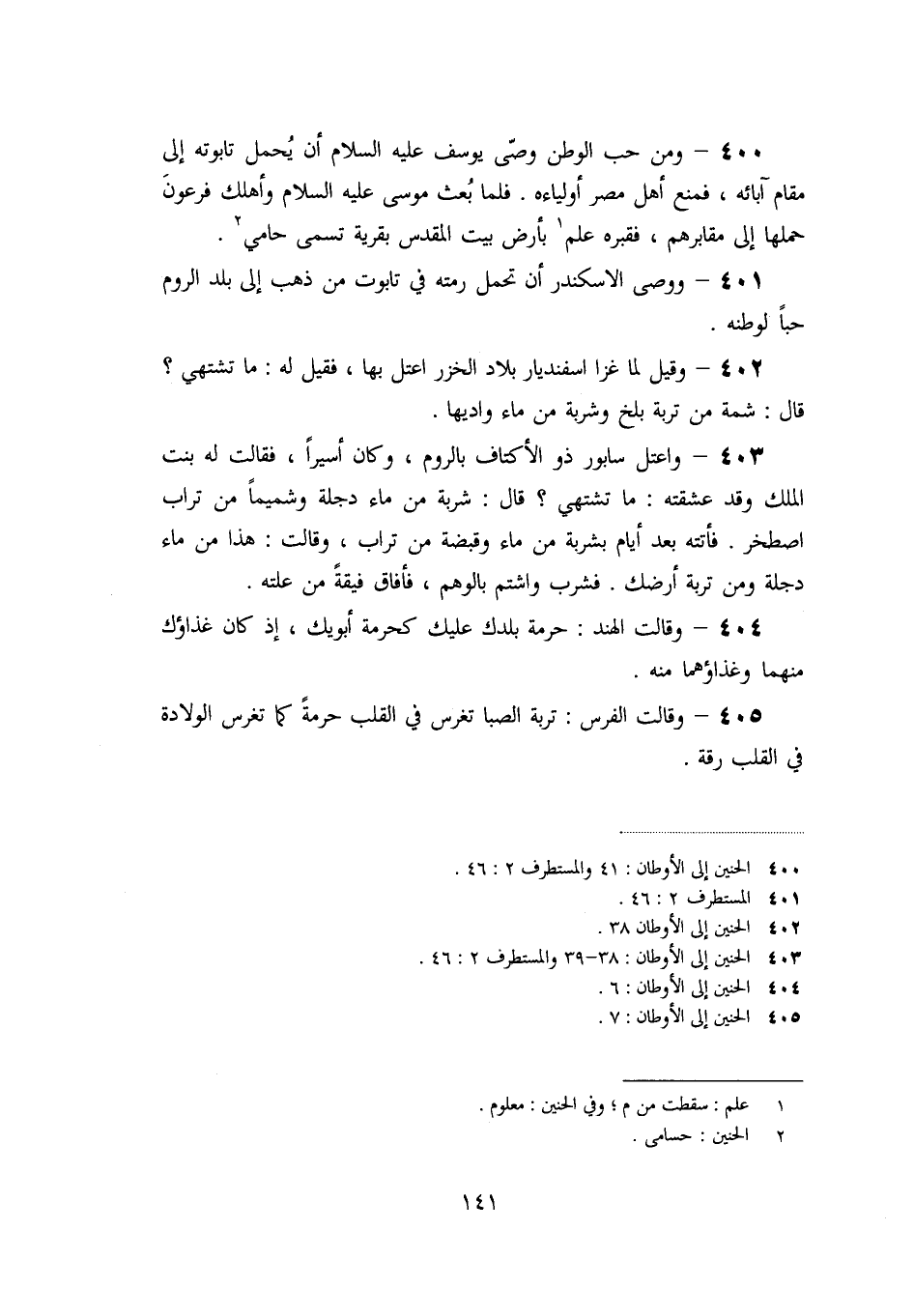 «400» - ومن حب الوطن وصّى يوسف عليه السلام أن يحمل تابوته إلى مقام آبائه، فمنع أهل مصر أولياءه. فلما بعث موسى عليه السلام وأهلك فرعون حملها إلى مقابرهم، فقبره علم [1] بأرض بيت المقدس بقرية تسمى حامي [2] .