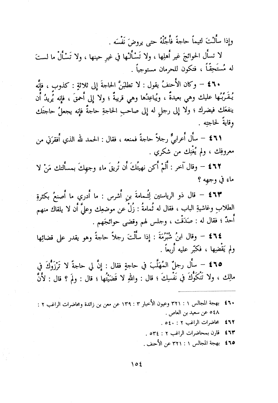 «465» - سأل رجل المهلّب في حاجة فقال: إنّ لي حاجة لا ترزؤك في مالك، ولا تنكؤك في نفسك؛ قال: والله لا قضيتها؛ قال: ولم؟ قال: لأنّ