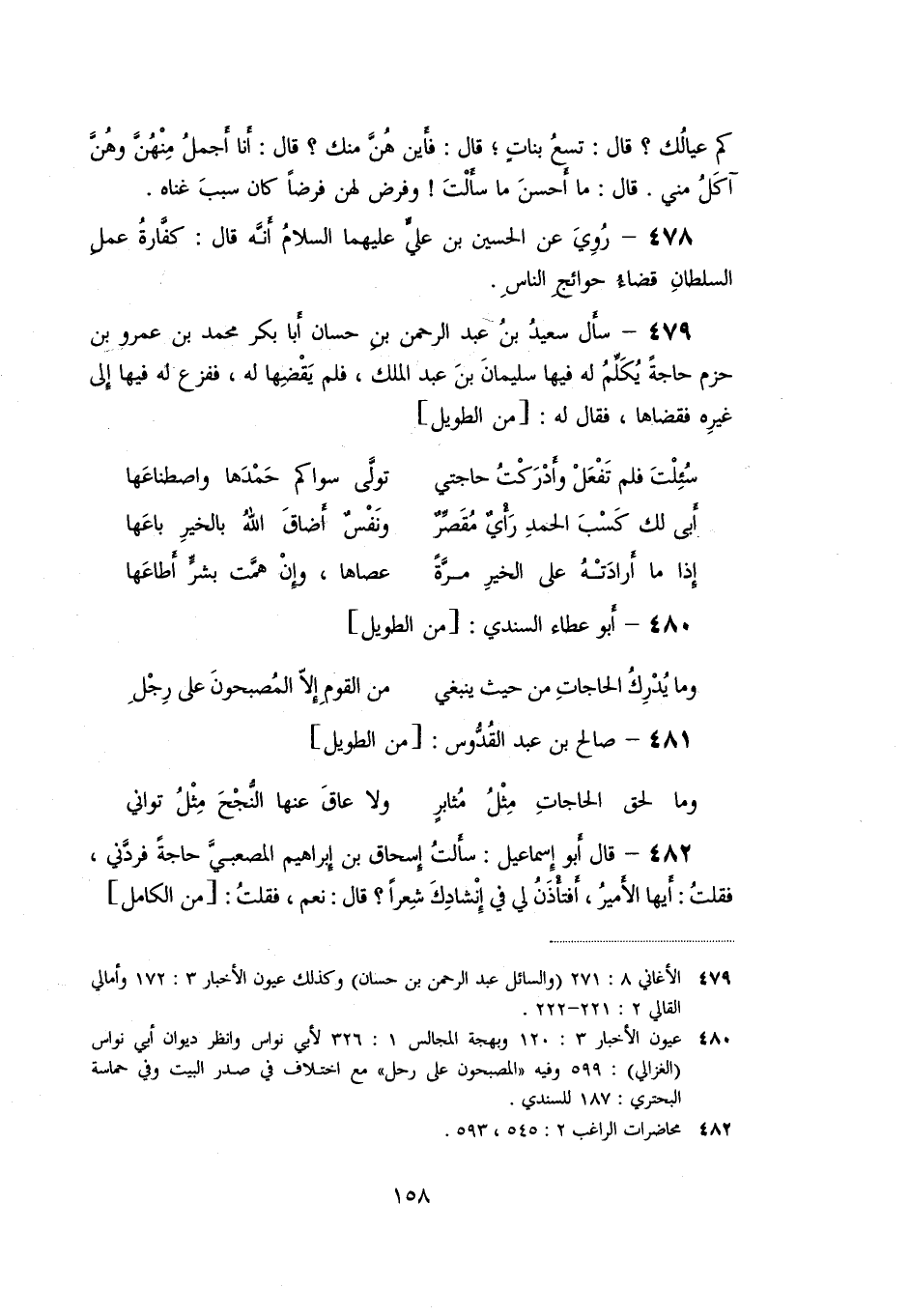 «479» - سأل سعيد بن عبد الرحمن بن حسان أبا بكر محمد بن عمرو بن حزم حاجة يكلّم له فيها سليمان بن عبد الملك، فلم يقضها له، ففزع له فيها إلى غيره فقضاها، فقال له: [من الطويل]