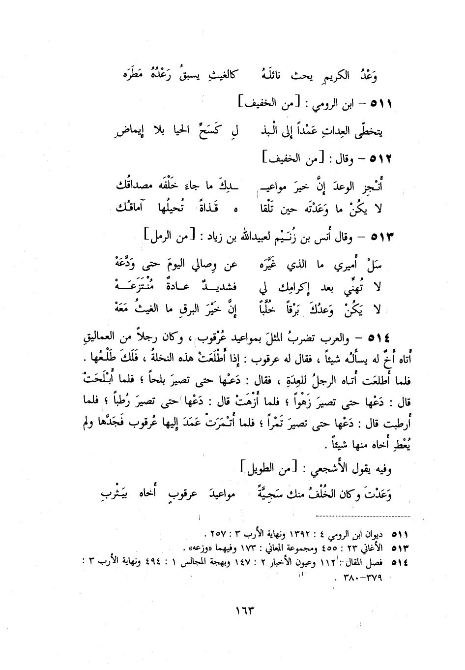 «514» - والعرب تضرب المثل بمواعيد عرقوب، وكان رجلا من العماليق أتاه أخ له يسأله شيئا، فقال له عرقوب: إذا أطلعت هذه النخلة، فلك طلعها.
