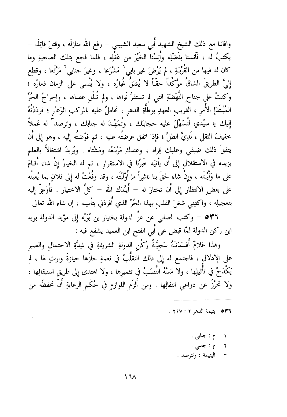 وهذا غلام أفسدته سجيّة ركن الدولة الشريفة في شدّة الاحتمال والصبر على الإدلال، فاجتمع له إلى ذلك التقلّب في نعمة حازها حيازة وارث لها، لم يكدح في تأثيلها، ولا مسّه النّصب في تثميرها، ولا اهتدى إلى طريق استبقائها، ولا تحرّز عن دواعي انتقالها. ومن ألزم اللوازم في حكم الرعاية أن نحفظه من