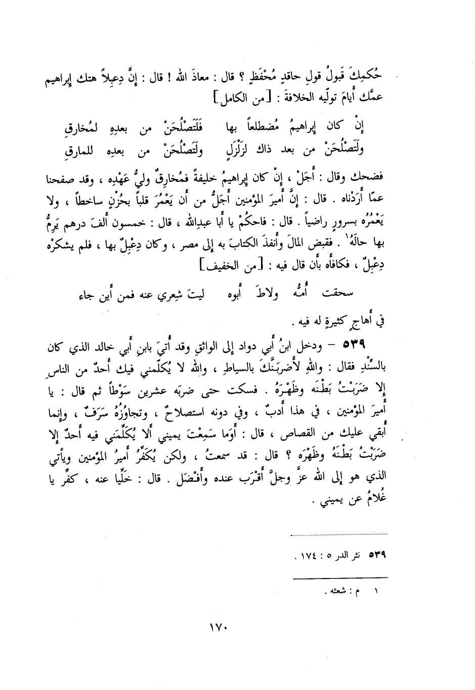 حكمك قبول قول حاقد محفظ؟ قال: معاذ الله! قال: إنّ دعبلا هتك إبراهيم عمّك أيام تولّيه الخلافة: [من الكامل]
