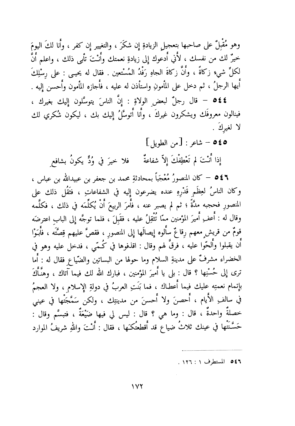 «546» - كان المنصور معجبا بمحادثة محمد بن جعفر بن عبيد الله بن عباس، وكان الناس لعظم قدره عنده يضرعون إليه في الشفاعات، فثقل ذلك على المنصور فحجبه مدّة؛ ثم لم يصبر عنه، فأمر الربيع أن يكلّمه في ذلك، فكلّمه وقال له: أعف أمير المؤمنين ممّا تثقل عليه، فقبل، فلما توجّه إلى الباب اعترضه قوم من قريش معهم رقاع سألوه إيصالها إلى المنصور، فقصّ عليهم قصّته، فأبوا أن يقبلوا وألحّوا عليه، فرقّ لهم وقال: اقذفوها في كمّي، فدخل عليه وهو في الخضراء مشرف على مدينة السلام وما حولها من البساتين والضّياع فقال له: أما ترى إلى حسنها؟ قال: بلى يا أمير المؤمنين، فبارك الله لك فيما آتاك، وهنّأك بإتمام نعمته عليك فيما أعطاك، فما بنت العرب في دولة الإسلام، ولا العجم في سالف الأيام، أحصن ولا أحسن من مدينتك، ولكن سمّجتها في عيني خصلة واحدة، قال: وما هي؟ قال: ليس لي فيها ضيعة، فتبسّم وقال: