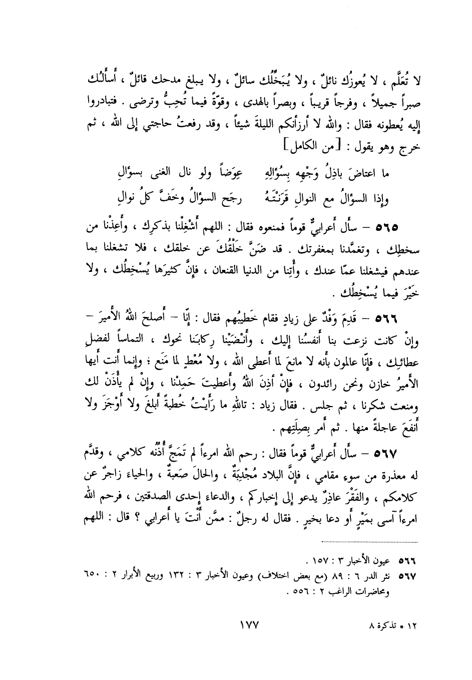 «567» - سأل أعرابيّ قوما فقال: رحم الله امرءا لم تمجّ أذنه كلامي، وقدّم له معذرة من سوء مقامي، فإنّ البلاد مجدبة، والحال صعبة، والحياء زاجر عن كلامكم، والفقر عاذر يدعو إلى إخباركم، والدعاء إحدى الصدقتين، فرحم الله امرءا آسى بمير أو دعا بخير. فقال له رجل: ممّن أنت يا أعرابي؟ قال: اللهم