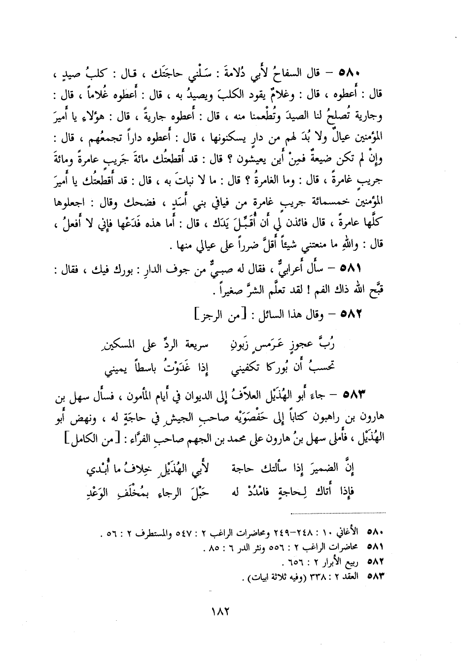 «583» - جاء أبو الهذيل العلّاف إلى الديوان في أيام المأمون، فسأل سهل بن هارون بن راهبون كتابا إلى حفصويه صاحب الجيش في حاجة له، ونهض أبو الهذيل، فأملى سهل بن هارون على محمد بن الجهم صاحب الفراء: [من الكامل]