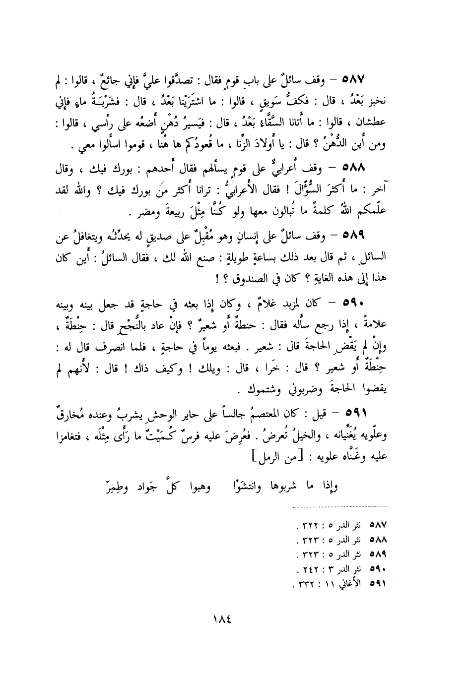 «589» - وقف سائل على إنسان وهو مقبل على صديق له يحدّثه ويتغافل عن السائل، ثم قال بعد ذلك بساعة طويلة: صنع الله لك، فقال السائل: أين كان هذا إلى هذه الغاية؟ كان في الصندوق؟! «590» - كان لمزبد غلام، وكان إذا بعثه في حاجة قد جعل بينه وبينه علامة، إذا رجع سأله فقال: حنطة أو شعير؟ فإن عاد بالنّجح قال: حنطة، وإن لم يقض الحاجة قال: شعير. فبعثه يوما في حاجة، فلما انصرف قال له: