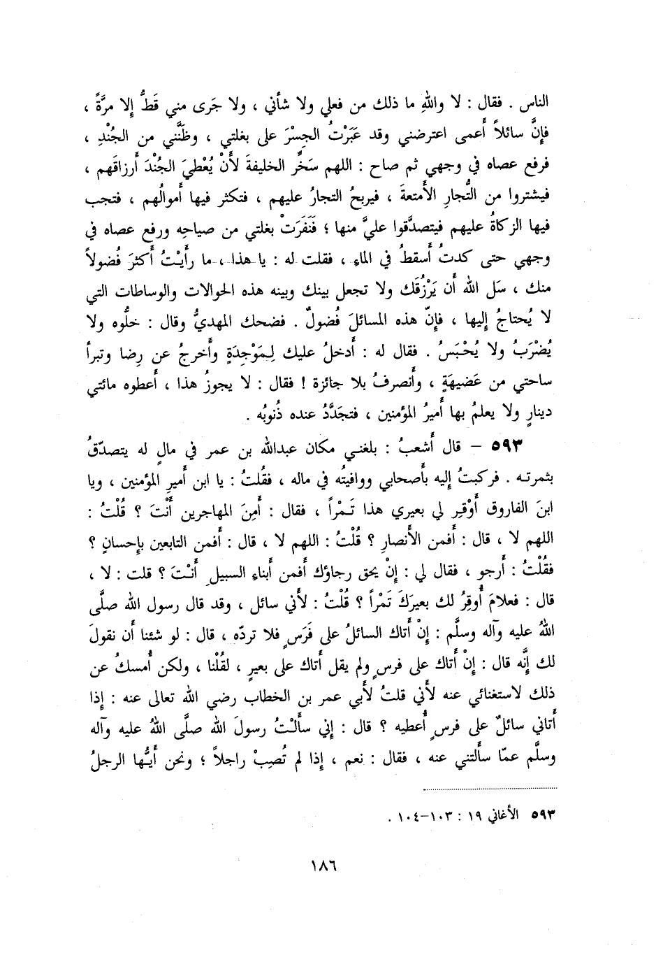«593» - قال أشعب: بلغني مكان عبد الله بن عمر في مال له يتصدّق بثمرته. فركبت إليه بأصحابي ووافيته في ماله، فقلت: يا ابن أمير المؤمنين، ويا ابن الفاروق أوقر لي بعيري هذا تمرا، فقال: أمن المهاجرين أنت؟ قلت: