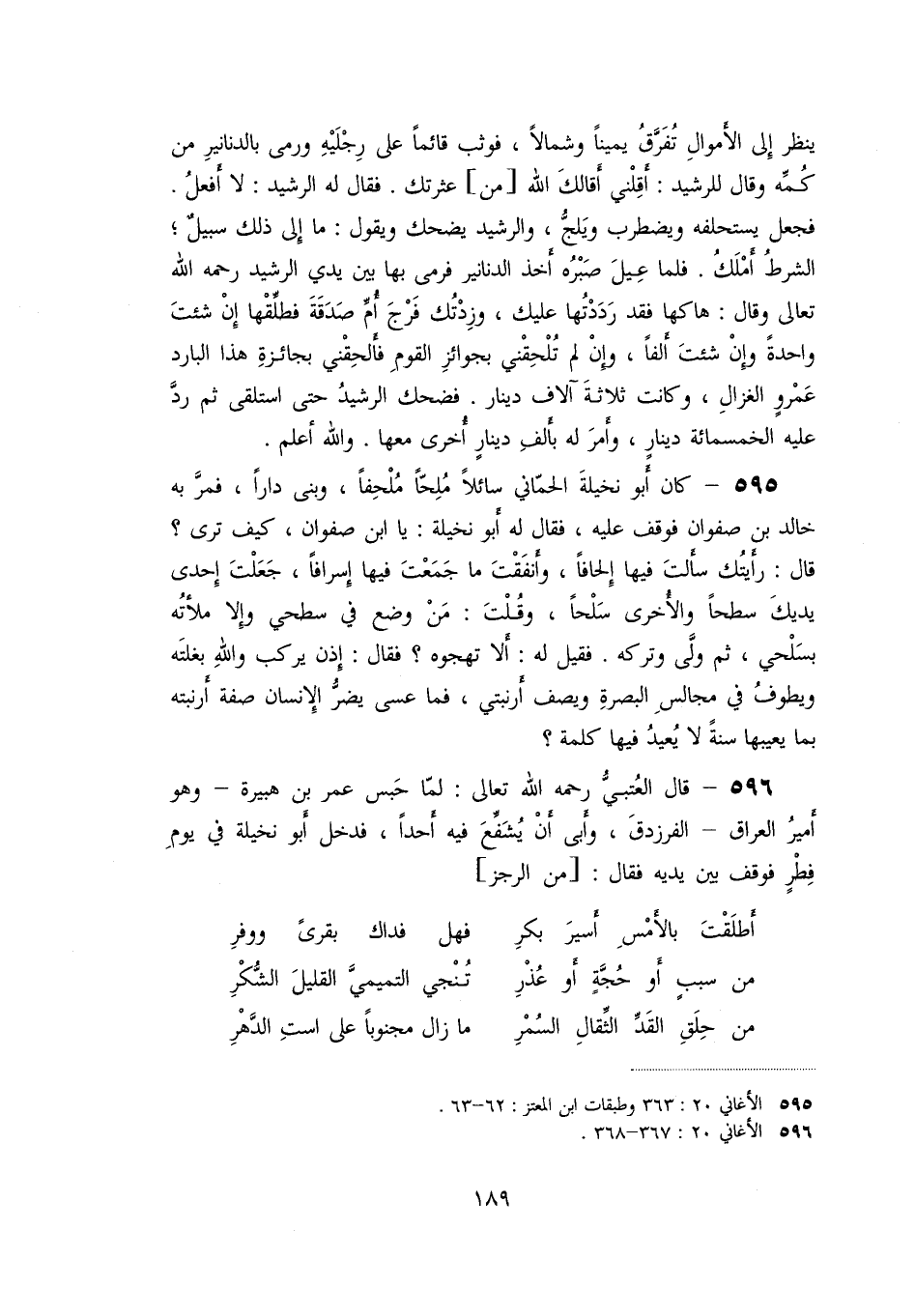 «595» - كان أبو نخيلة الحمّاني سائلا ملحّا ملحفا، وبنى دارا، فمرّ به خالد بن صفوان فوقف عليه، فقال له أبو نخيلة: يا ابن صفوان، كيف ترى؟