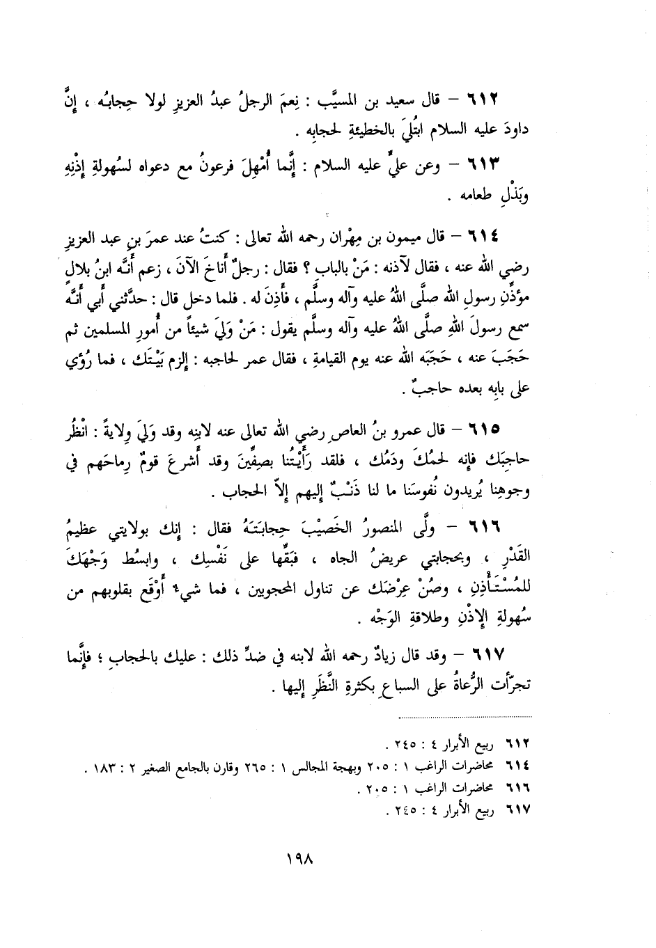 «612» - قال سعيد بن المسيّب: نعم الرجل عبد العزيز لولا حجابه، إنّ داود عليه السلام ابتلي بالخطيئة لحجابه.