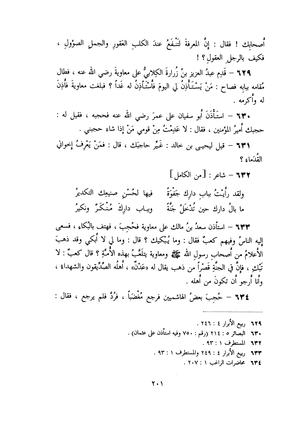 أصحابك! فقال: إنّ المعرفة لتنفع عند الكلب العقور والجمل الصؤول، فكيف بالرجل العقول؟! «629» - قدم عبد العزيز بن زرارة الكلابيّ على معاوية رضي الله عنه، فطال مقامه ببابه فصاح: من يستأذن لي اليوم فأستأذن له غدا؟ فبلغت معاوية فأذن له وأكرمه.