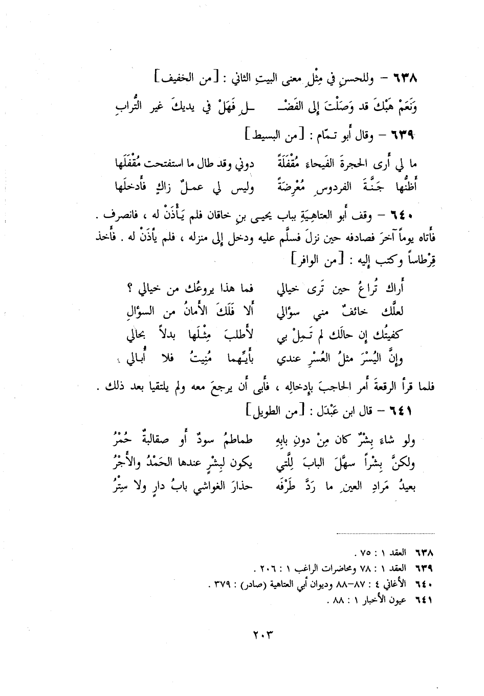 «640» - وقف أبو العتاهية بباب يحيى بن خاقان فلم يأذن له، فانصرف.