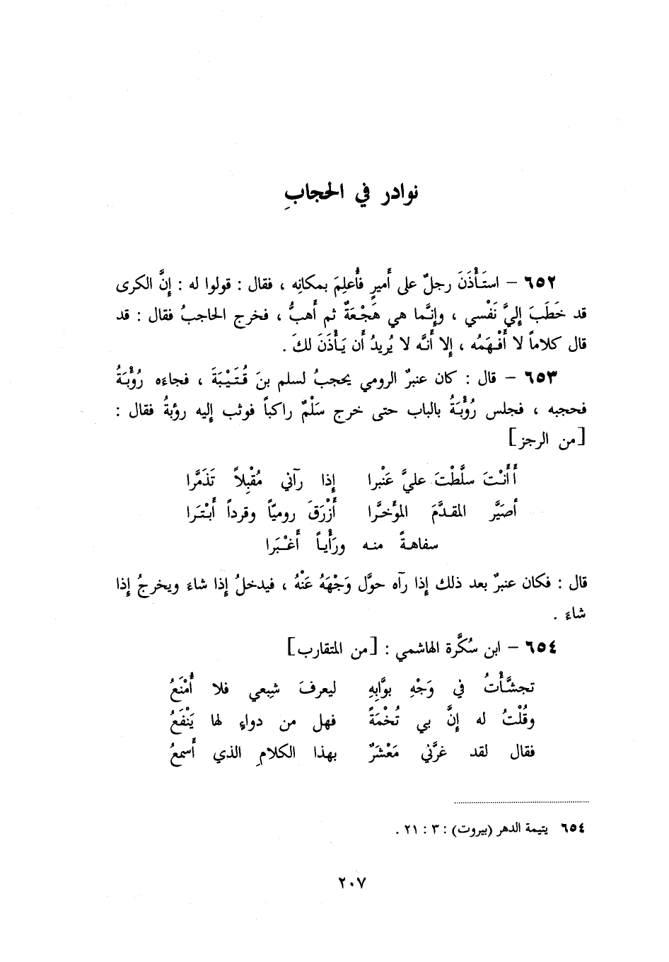 653- قال: كان عنبر الرومي يحجب لسلم بن قتيبة، فجاءه رؤبة فحجبه، فجلس رؤبة بالباب حتى خرج سلم راكبا فوثب إليه رؤبة فقال: