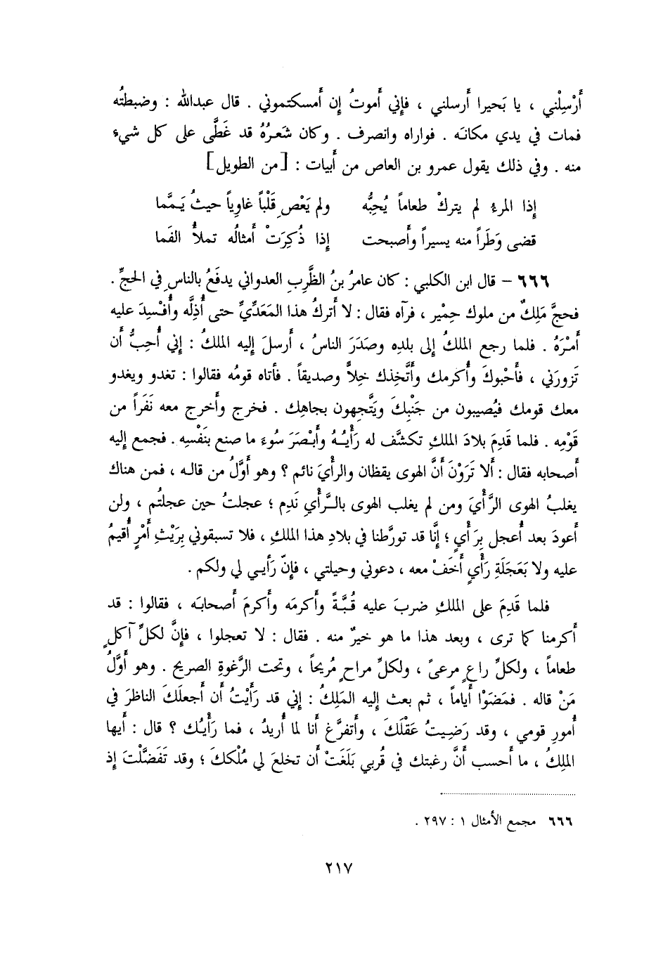 فحجّ ملك من ملوك حمير، فرآه فقال: لا أترك هذا المعدّيّ حتى أذلّه وأفسد عليه أمره. فلما رجع الملك إلى بلده وصدر الناس، أرسل إليه الملك: إني أحبّ أن تزورني، فأحبوك وأكرمك وأتّخذك خلّا وصديقا. فأتاه قومه فقالوا: تغدو ويغدو معك قومك فيصيبون من جنبك ويتّجهون بجاهك. فخرج وأخرج معه نفرا من قومه. فلما قدم بلاد الملك تكشّف له رأيه وأبصر سوء ما صنع بنفسه. فجمع إليه أصحابه فقال: ألا ترون أنّ الهوى يقظان والرأي نائم؟ وهو أوّل من قاله، فمن هناك يغلب الهوى الرّأي ومن لم يغلب الهوى بالرّأي ندم؛ عجلت حين عجلتم، ولن أعود بعد أعجل برأي؛ إنّا قد تورّطنا في بلاد هذا الملك، فلا تسبقوني بريث أمر أقيم عليه ولا بعجلة رأي أخف معه، دعوني وحيلتي، فإنّ رأيي لي ولكم.