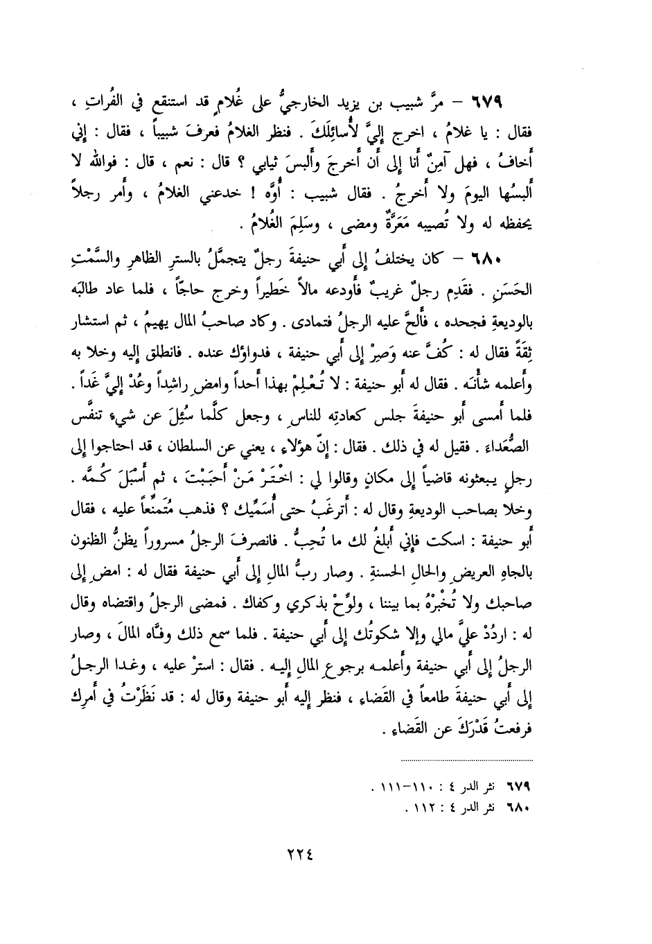 «679» - مرّ شبيب بن يزيد الخارجيّ على غلام قد استنقع في الفرات، فقال: يا غلام، اخرج إليّ لأسائلك. فنظر الغلام فعرف شبيبا، فقال: إني أخاف، فهل آمن أنا إلى أن أخرج وألبس ثيابي؟ قال: نعم، قال: فو الله لا ألبسها اليوم ولا أخرج. فقال شبيب: أوّه! خدعني الغلام، وأمر رجلا يحفظه له ولا تصيبه معرّة ومضى، وسلّم الغلام.