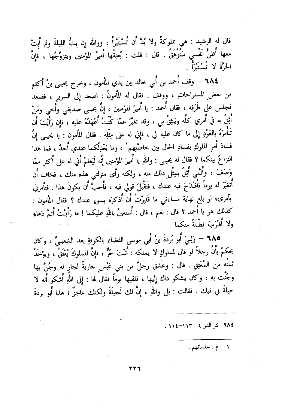«684» - وقف أحمد بن أبي خالد بين يدي المأمون، وخرج يحيى بن أكثم من بعض المستراحات، ووقف. فقال له المأمون: اصعد إلى السرير، فصعد فجلس على طرفه، فقال أحمد: يا أمير المؤمنين، إنّ يحيى صديقي وأخي ومن أثق به في أمري كلّه ويثق بي، وقد تغيّر عمّا كنت أعهده عليه، فإن رأيت أن تأمره بالعود إلى ما كان عليه لي، فإني له على مثله. فقال المأمون: يا يحيى إنّ فساد أمر الملوك بفساد الحال بين خاصّتهم [1] ، وما يعدلكما عندي أحد، فما هذا النزاع بينكما؟ فقال له يحيى: والله يا أمير المؤمنين إنّه ليعلم أني له على أكثر ممّا وصف، وأنّني أثق بمثل ذلك منه، ولكنه رأى منزلتي هذه منك، فخاف أن أتغيّر له يوما فأقدح فيه عندك، فتقبل قولي فيه، فأحبّ أن يكون هذا. فتأمرني بامرىء لو بلغ نهاية مساءتي ما قدرت أن أذكره بسوء عندك؟ فقال المأمون: