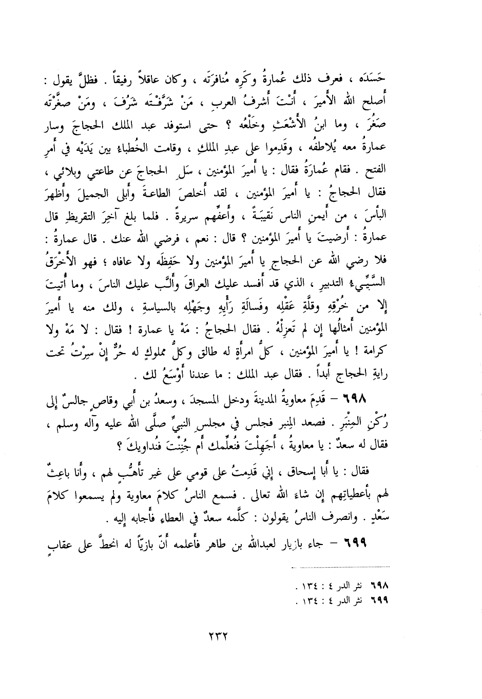 «698» - قدم معاوية المدينة ودخل المسجد، وسعد بن أبي وقاص جالس إلى ركن المنبر. فصعد المنبر فجلس في مجلس النبيّ صلّى الله عليه وآله وسلّم، فقال له سعد: يا معاوية، أجهلت فنعلّمك أم جننت فنداويك؟