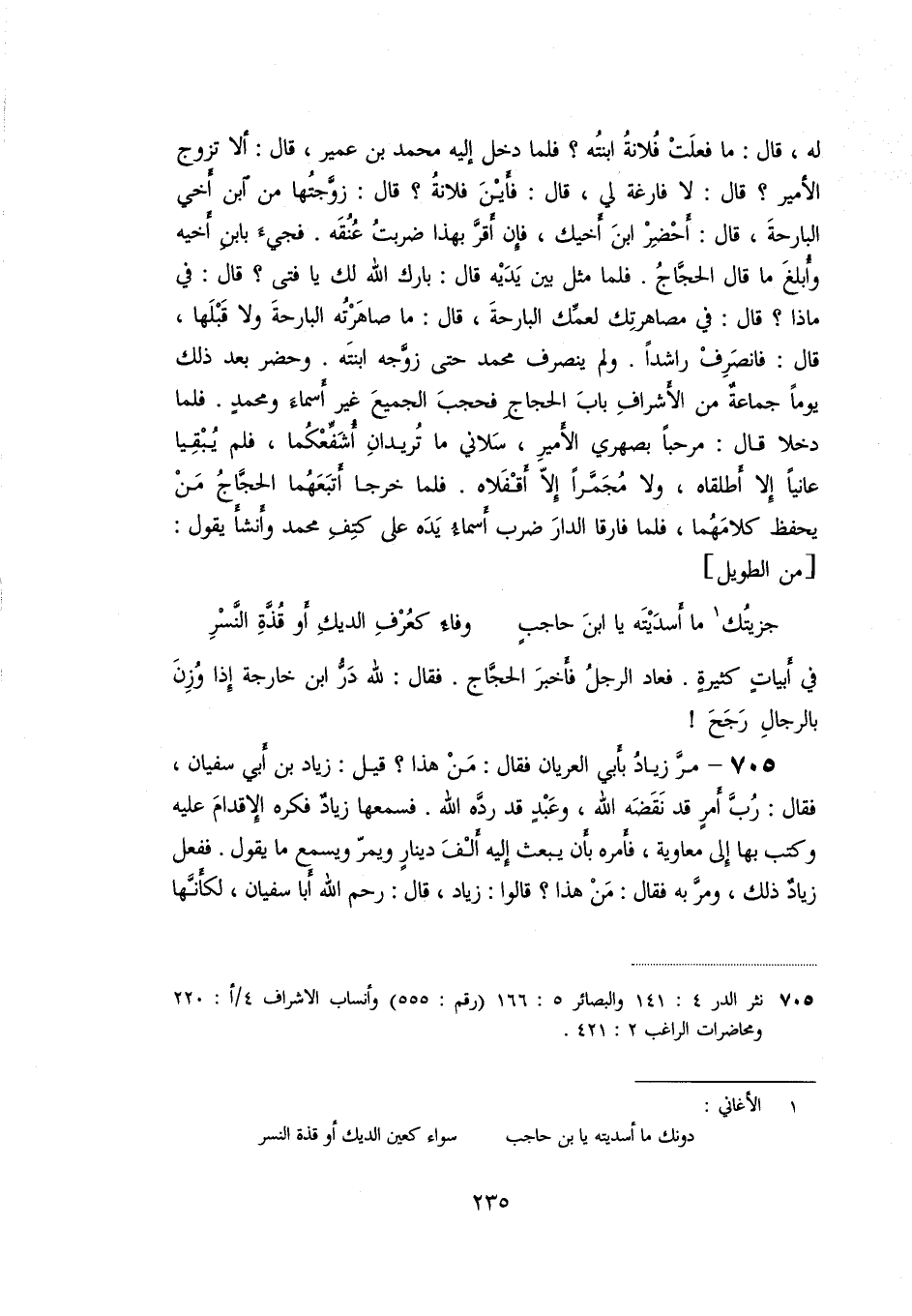 في أبيات كثيرة. فعاد الرجل فأخبر الحجّاج. فقال: لله درّ ابن خارجة إذا وزن بالرجال رجح! «705» - مرّ زياد بأبي العريان فقال: من هذا؟ قيل: زياد بن أبي سفيان، فقال: ربّ أمر قد نقضه الله، وعبد قد ردّه الله. فسمعها زياد فكره الإقدام عليه وكتب بها إلى معاوية، فأمره بأن يبعث إليه ألف دينار ويمرّ ويسمع ما يقول. ففعل زياد ذلك، ومرّ به فقال: من هذا؟ قالوا: زياد، قال: رحم الله أبا سفيان، لكأنّها