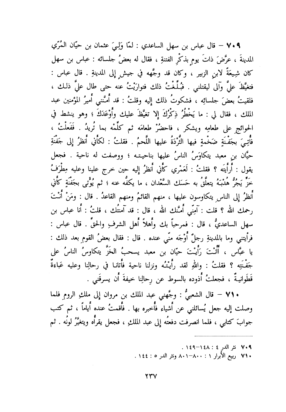 «709» - قال عباس بن سهل الساعدي: لمّا ولي عثمان بن حيّان المرّي المدينة، عرّض ذات يوم بذكر الفتنة، فقال له بعض جلسائه: عباس بن سهل كان شيعة لابن الزبير، وكان قد وجّهه في جيش إلى المدينة. قال عباس: