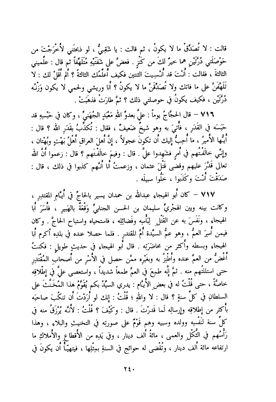 717- كان أبو الهيجاء عبد الله بن حمدان يسير بالحاجّ في أيّام المقتدر، وكانت بينه وبين الهجريّ سليمان بن الحسن الجنابيّ وقعة بالهبير، فأسر أبا الهيجاء، ونفس به عن القتل لبأسه وفضائله، فاستحياه واستباح الحاجّ. وكان فيمن أسر العمّ، وهو عمّ السيّدة أمّ المقتدر. فلما حصلا عنده في بلده أكرم أبا الهيجاء وبسطه وأكثر من محاضرته. قال أبو الهيجاء في حديث طويل: فكنت أغضّ من العمّ عنده وأطنز به وبغيره ممّن حصل في الأسر من أصحاب المقتدر حتى استللتهم منه. ثمّ إنّه طمع في العمّ طمعا شديدا، واستعصى عليّ في إطلاقه خاصّة، حتى قلت له في بعض الأيّام: يدري السيّد بكم يقوّم هذا المخنّث على السلطان في كلّ سنة؟ قال: لا والله؛ قلت: إنك لو أردت أن تنكب صاحبه بأكثر من إطلاقه وإرساله لما قدرت. قال: وكيف؟ قلت: لأنّه يرزق منه في كلّ سنة لنفسه وولده وسبيه وهم قوم على صورته في التخنيث والبلاء، وهذا رأسهم في الثّكل والعمى، مائة ألف دينار، وفي يده من الأقطاع والأملاك ما ارتفاعه مائة ألف دينار، وتقضى له حوائج في السنة بمثلها، فيتهيّأ أن يكون في