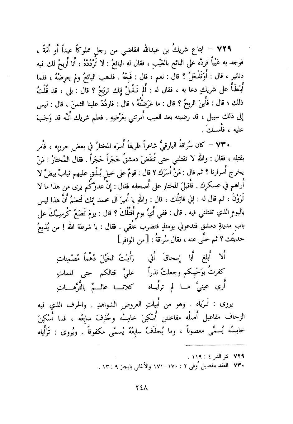 «730» - كان سراقة البارقيّ شاعرا ظريفا أسره المختار في بعض حروبه، فأمر بقتله، فقال: والله لا تقتلني حتى تنقض دمشق حجرا حجرا. فقال المختار: من يخرج أسرارنا؟ ثم قال: من أسرك؟ قال: قوم على خيل بلق عليهم ثياب بيض لا أراهم في عسكرك. فأقبل المختار على أصحابه فقال: إنّ عدوّكم يرى من هذا ما لا ترون، ثم قال له: إني قاتلك، قال: والله يا أمير آل محمد إنك لتعلم أنّ هذا ليس باليوم الذي تقتلني فيه. قال: ففي أيّ يوم أقتلك؟ قال: يوم تضع كرسيّك على باب مدينة دمشق فتدعوني يومئذ فتضرب عنقي. فقال: يا شرطة الله! من يذيع حديثك؟ ثم خلّى عنه، فقال سراقة: [من الوافر]