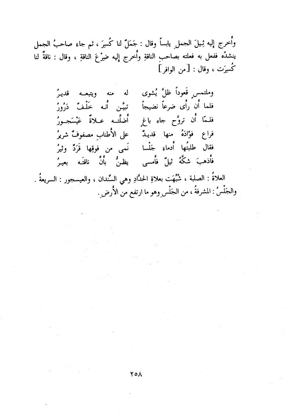 وأخرج إليه ثيل الجمل يابسا وقال: جمل لنا كسر، ثم جاء صاحب الجمل ينشده ففعل به فعلته بصاحب الناقة وأخرج إليه ضرع الناقة، وقال: ناقة لنا كسرت، وقال: [من الوافر]