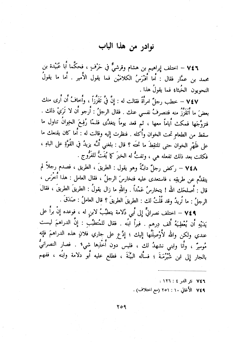 «749» - اختلف نصرانيّ إلى أبي دلامة يتطبّب لابن له، فوعده إن برأ على يديه أن يعطيه ألف درهم. فبرأ ابنه. فقال للمتطبّب: إنّ الدراهم ليست عندي ولكن والله لأوصلنّها إليك؛ ادّع على جاري فلان هذه الدراهم فإنه موسر، وأنا وابني نشهد لك، فليس دون أخذها شيء. فصار النصرانيّ بالجار إلى ابن شبرمة؛ فسأله البيّنة، فطلع عليه أبو دلامة وابنه، ففهم