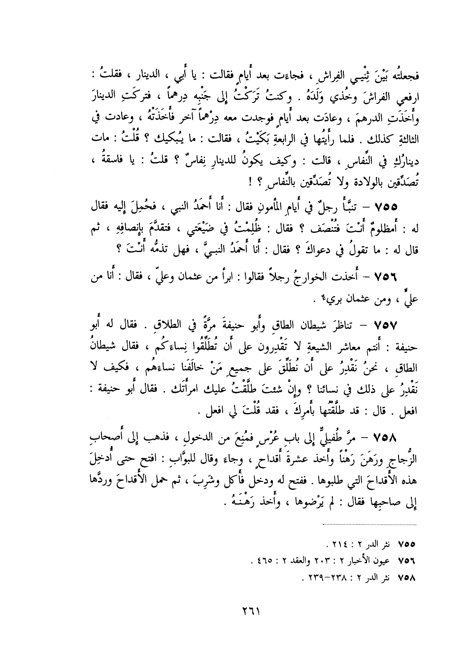 ارفعي الفراش وخذي ولده. وكنت تركت إلى جنبه درهما، فتركت الدينار وأخذت الدرهم، وعادت بعد أيام فوجدت معه درهما آخر فأخذته، وعادت في الثالثة كذلك. فلما رأيتها في الرابعة بكيت، فقالت: ما يبكيك؟ قلت: مات دينارك في النّفاس، قالت: وكيف يكون للدينار نفاس؟ قلت: يا فاسقة، تصدّقين بالولادة ولا تصدّقين بالنّفاس؟! «755» - تنبّأ رجل في أيام المأمون فقال: أنا أحمد النبي، فحمل إليه فقال له: أمظلوم أنت فتنصف؟ فقال: ظلمت في ضيعتي، فتقدّم بإنصافه، ثم قال له: ما تقول في دعواك؟ فقال: أنا أحمد النبيّ، فهل تذمّه أنت؟